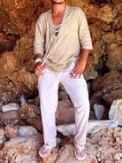 Deze heren blouse met v-hals vetersluiting en 3/4 mouwen is dé must-have voor een stijlvolle beach-ready look. Het lichte linnenachtige materiaal voelt koel aan op de huid en zorgt voor ultiem draagcomfort. De losse pasvorm en het unieke lace-up detail aan de voorzijde geven het shirt een nonchalante, bohemian uitstraling – ideaal voor strandwandelingen of relaxte terrasdagen.
