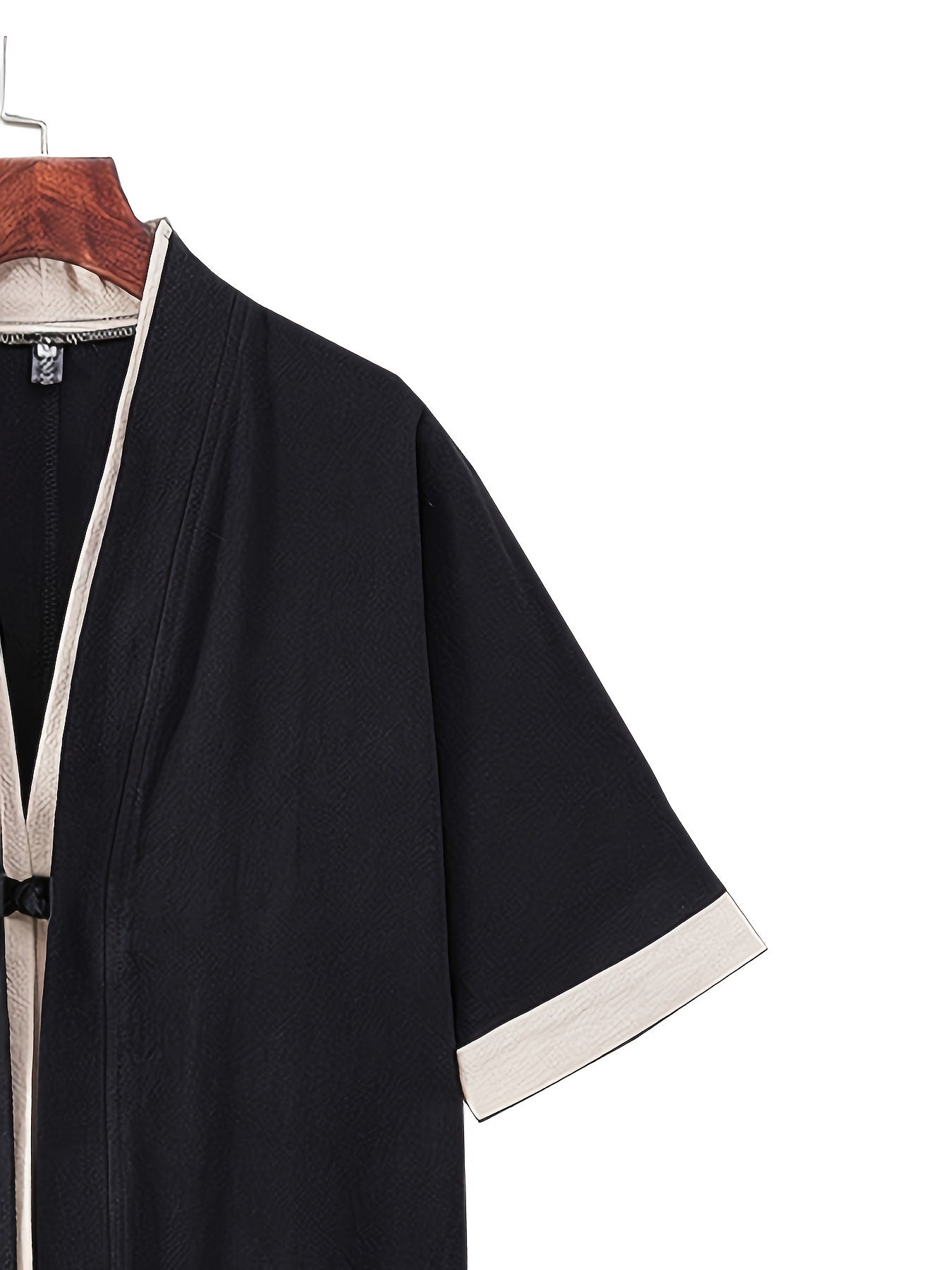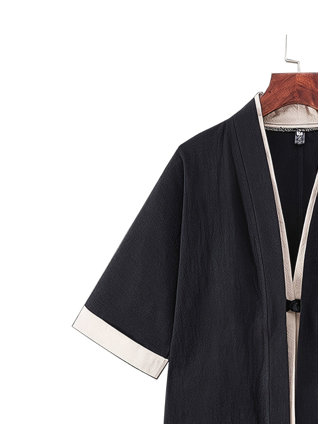 Deze heren kimono is geïnspireerd op traditionele Japanse styling, maar met een moderne twist. De open voorzijde en contrasterende biezen zorgen voor een clean silhouet dat moeiteloos past bij casual of streetwear looks. De wijde mouwen en luchtige stof bieden comfort en bewegingsvrijheid – ideaal als licht jasje voor de warmere maanden of als stijlvolle laag in je outfit. Een must-have voor liefhebbers van moderne, cultureel geïnspireerde mode.