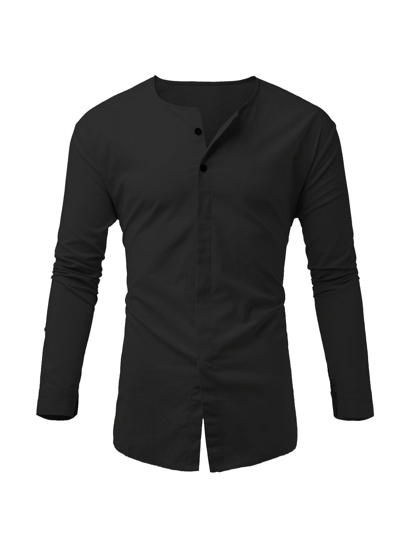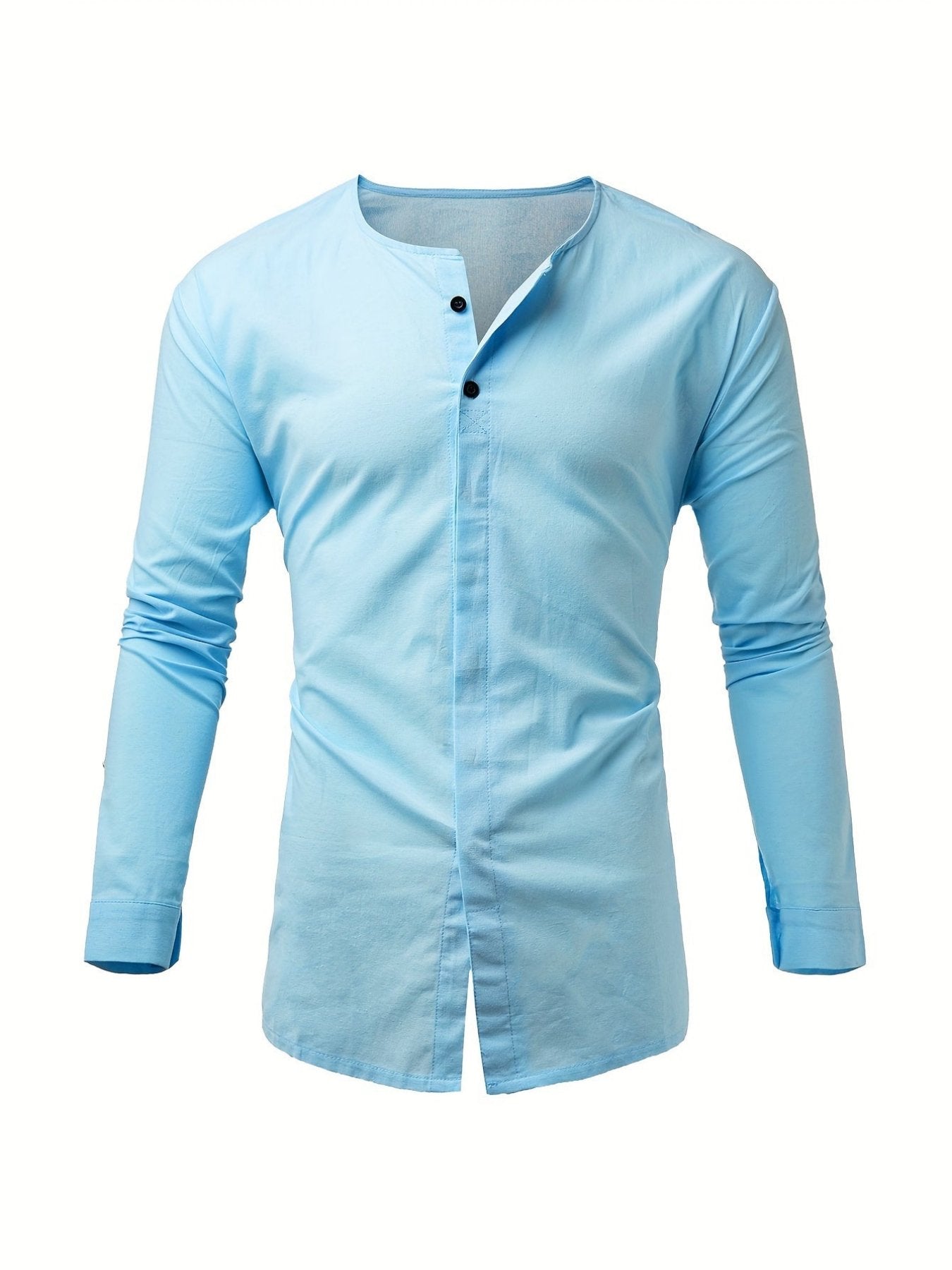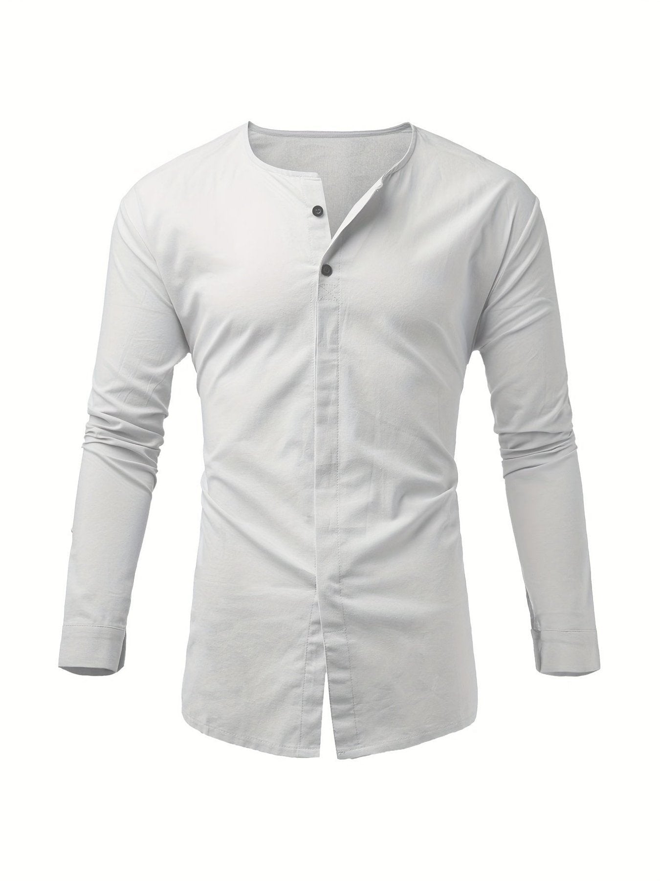 Met zijn cleane look en verfijnde details straalt dit overhemd ingetogen klasse uit. De opstaande mandarijnkraag geeft een moderne twist aan het klassieke model, terwijl de knoopsluiting en lange mouwen zorgen voor een veelzijdige pasvorm. Ideaal voor warme dagen dankzij het ademende katoen-linnenblend materiaal. Verkrijgbaar in zachte, natuurlijke kleuren zoals lichtgrijs, mintgroen, babyblauw, zwart en wit – perfect te combineren met elke outfit, van casual tot semi-formeel.
