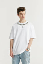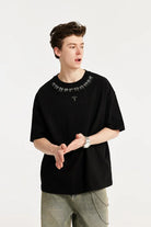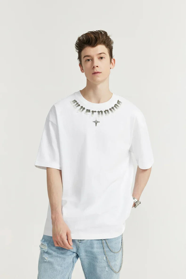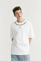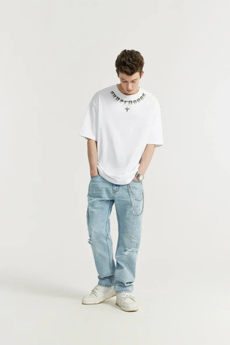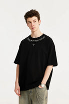 Dit oversized T-shirt tilt jouw casual outfit naar een hoger niveau dankzij de kettingprint rond de hals, inclusief gotische kruisdetails. De losse fit zorgt voor comfort en stijl, terwijl de zware katoenstof zorgt voor een premium feel. Draag hem solo voor een statement look of combineer met laagjes voor een meer gelaagde streetwear uitstraling.