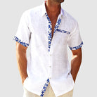 Dit overhemd tilt je zomerstijl moeiteloos naar een hoger niveau. Gemaakt van een lichte linnenlook stof met een relaxte pasvorm en unieke tropische boorddetails aan kraag, mouw en knoopsluiting. Of je nu op het strand loopt of een cocktail drinkt op het terras, dit shirt straalt vakantiesfeer uit. Verkrijgbaar in frisse kleuren zoals wit, navy, lichtblauw, zwart en limoen – perfect voor een tropisch accent in je garderobe.