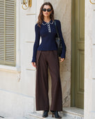 Draag de Navy Contrast Polo Knit met een wijde pantalon en loafers voor een chique city look. Ook perfect in combinatie met een midi-rok en laarzen voor een meer vrouwelijke stijl. Voeg een leren tas en zonnebril toe voor een elegante, tijdloze outfit.