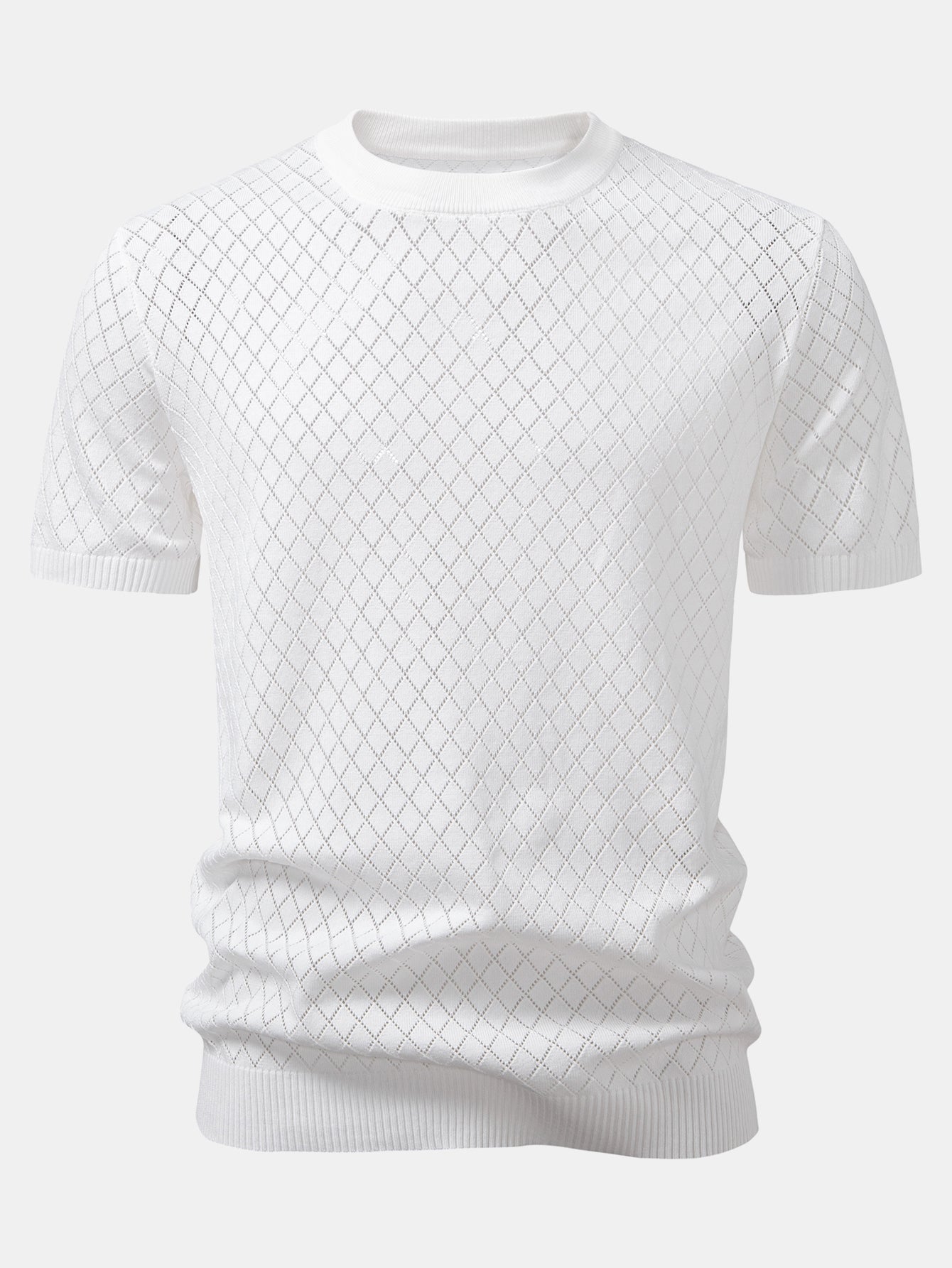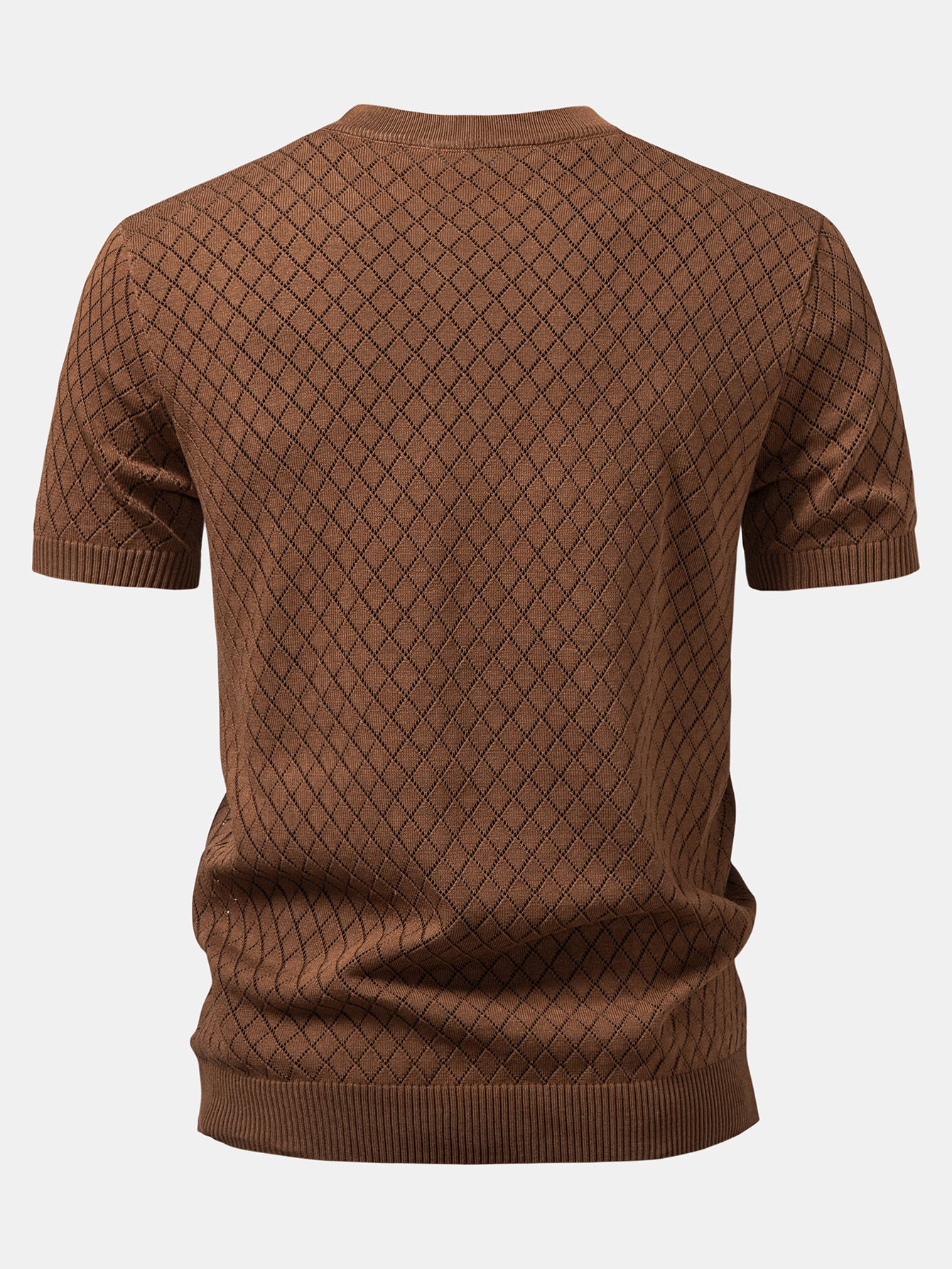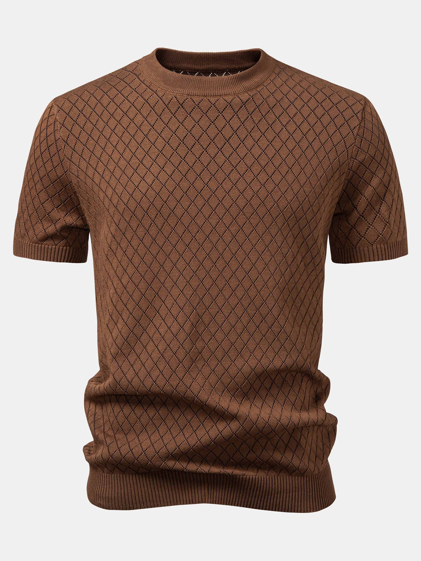 Het Diamond Texture Knit T-Shirt tilt je casual garderobe naar een hoger niveau met zijn elegante ruitstructuur. De gebreide stof voelt stevig en comfortabel aan, terwijl het verfijnde patroon een stijlvolle touch toevoegt. Ideaal voor wie houdt van subtiele luxe en een verzorgde uitstraling.