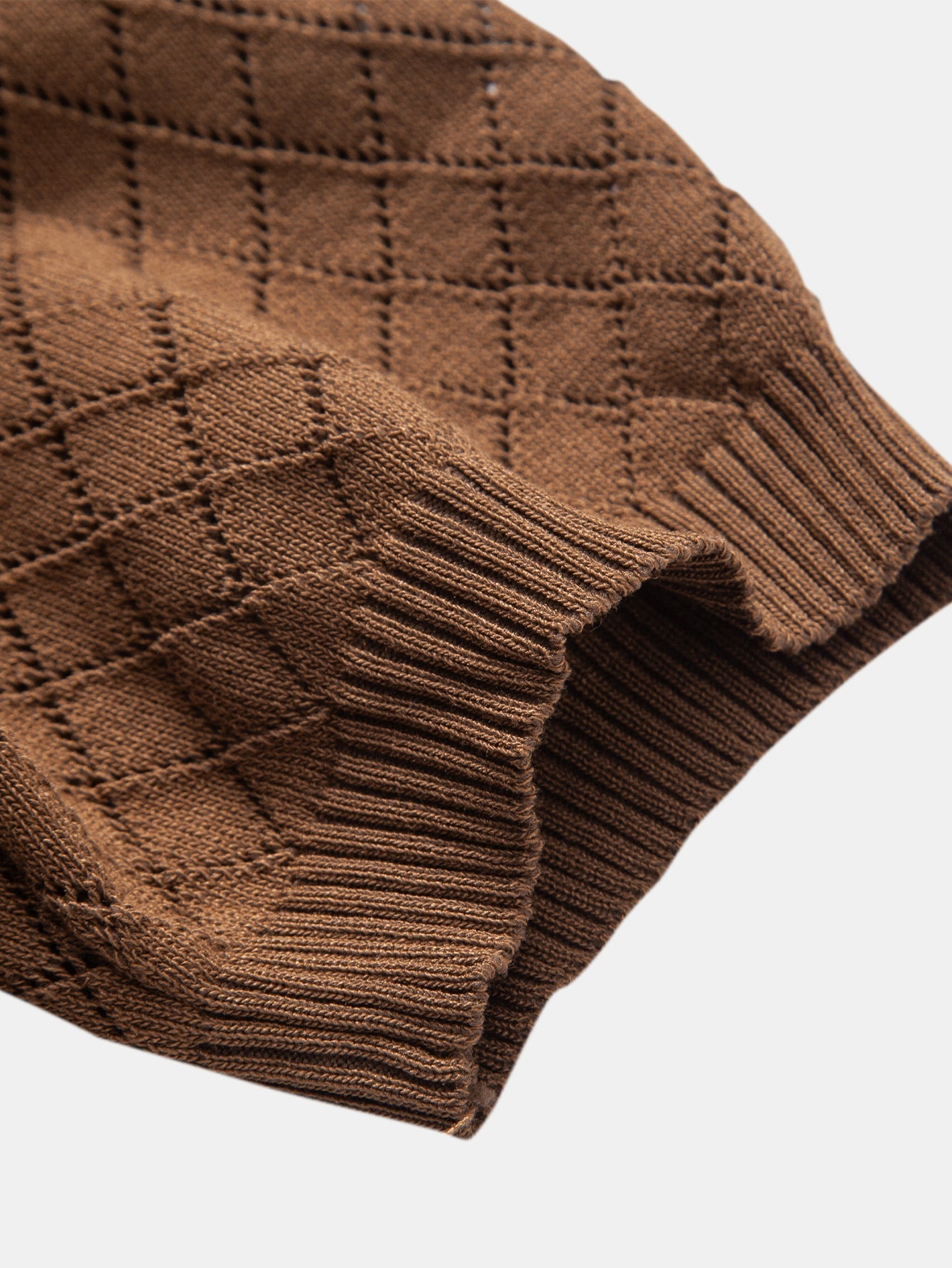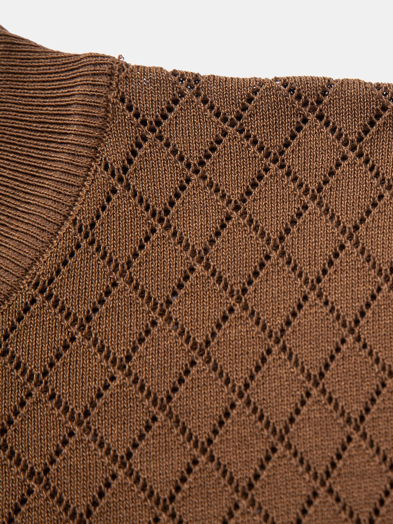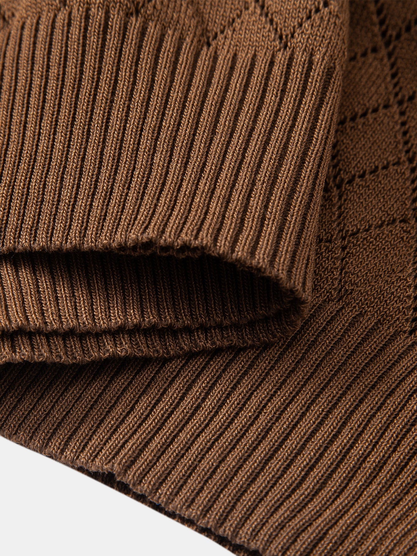 Combineer het Diamond Texture Knit T-Shirt met een nette chino of donkere jeans voor een semi-formele uitstraling. Perfect voor diners, kantooroutfits met flair, of wanneer je stijlvol voor de dag wilt komen zonder overdressed te zijn.