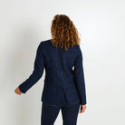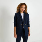 De Elégance Blazer is een stijlvolle klassieker met een moderne vrouwelijke touch. Dankzij de getailleerde pasvorm, dubbele knopenrij en rijke donkerblauwe tint is dit jasje perfect voor zowel formele als casual-chique gelegenheden. De subtiele structuur in de stof voegt extra diepte en klasse toe.