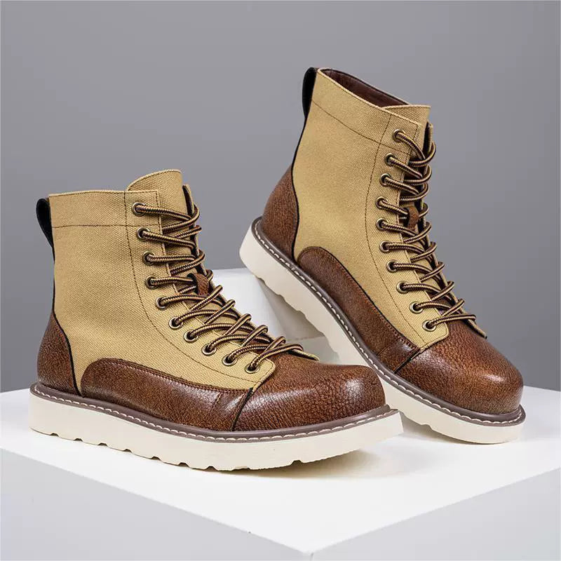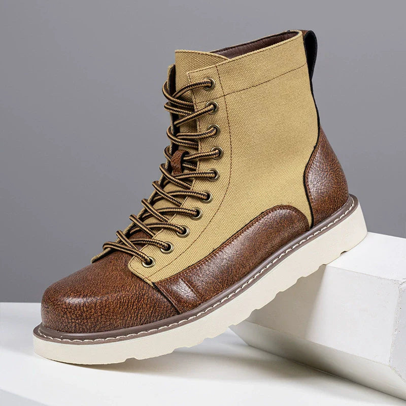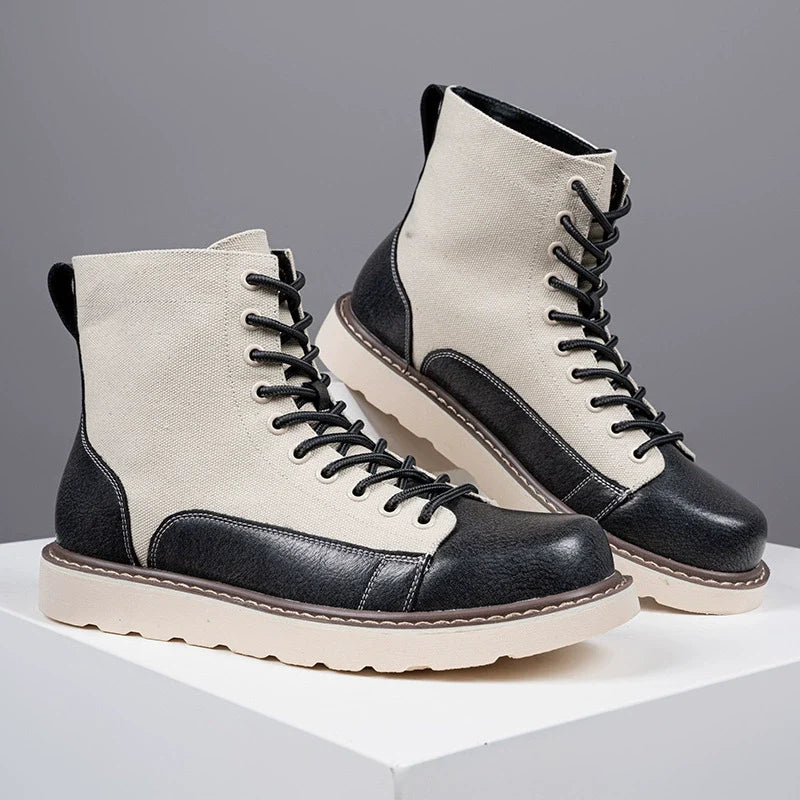 Draag de Contrast Canvas Boot met opgerolde jeans en een basic T-shirt voor een vintage casual look. Voeg een bomberjack of denim jas toe voor extra flair – perfect voor creatieve stadsoutfits met karakter