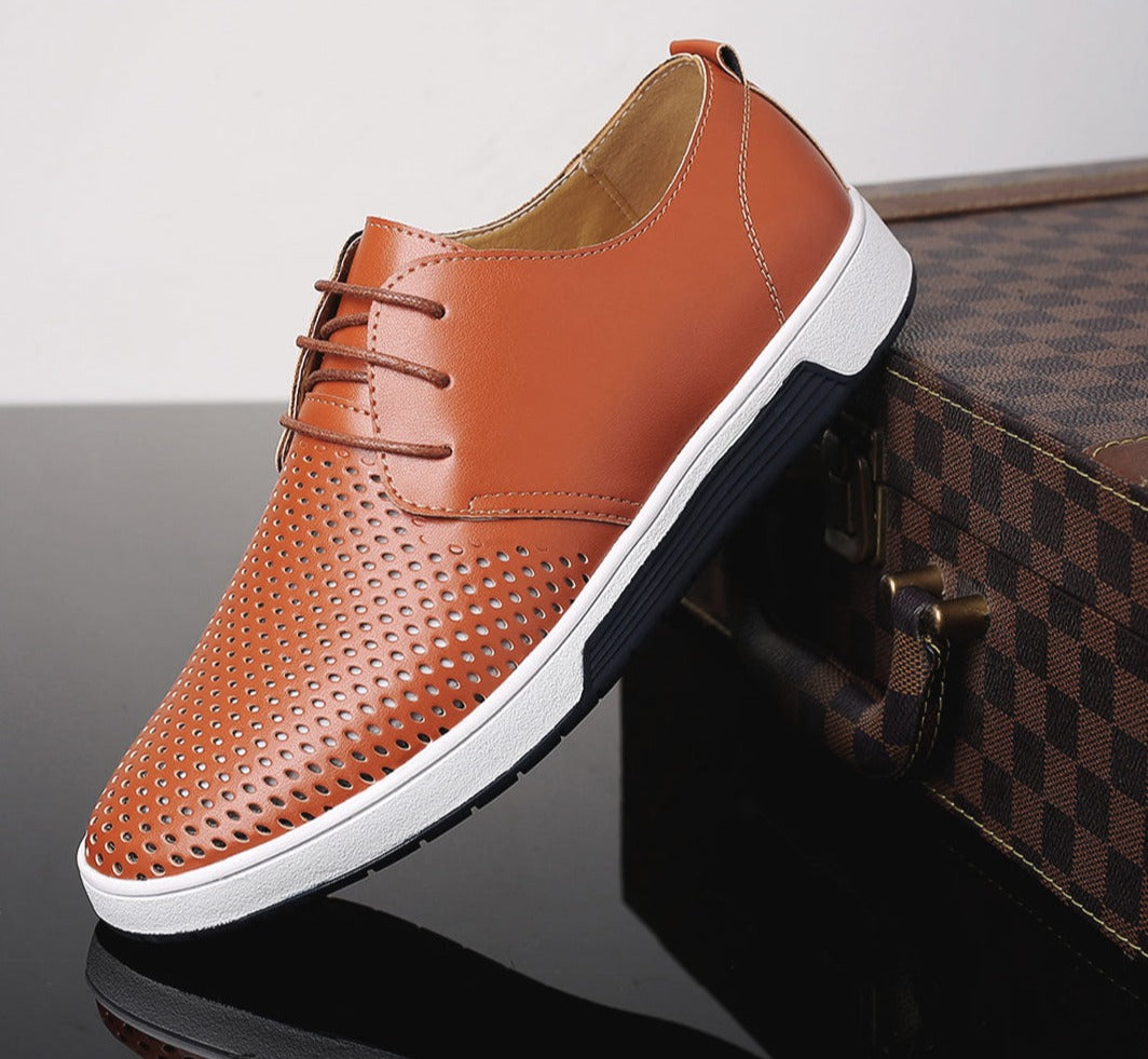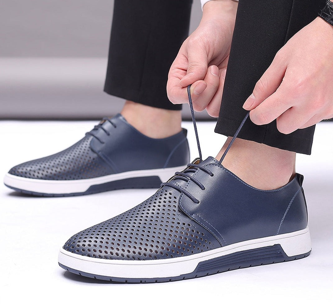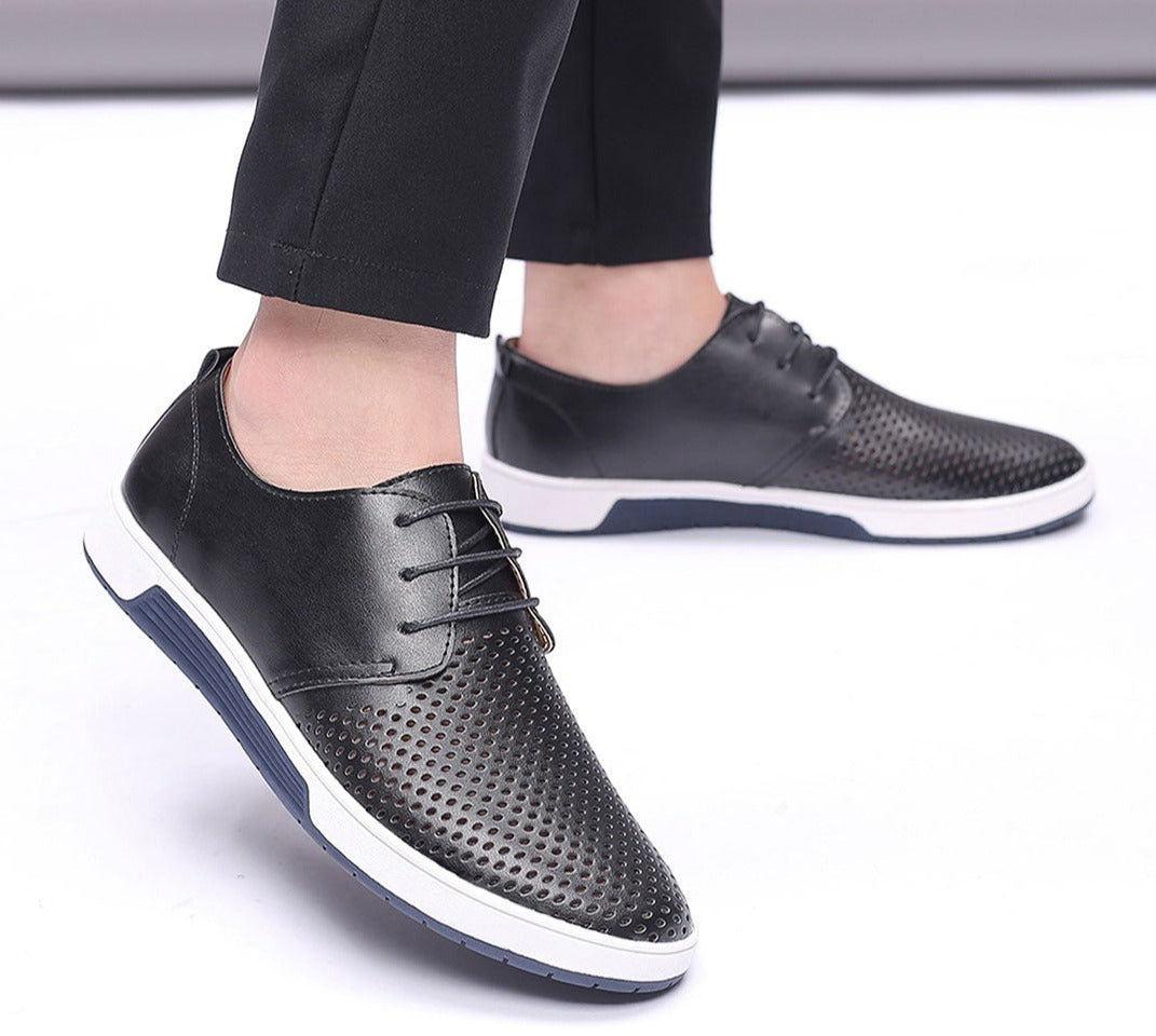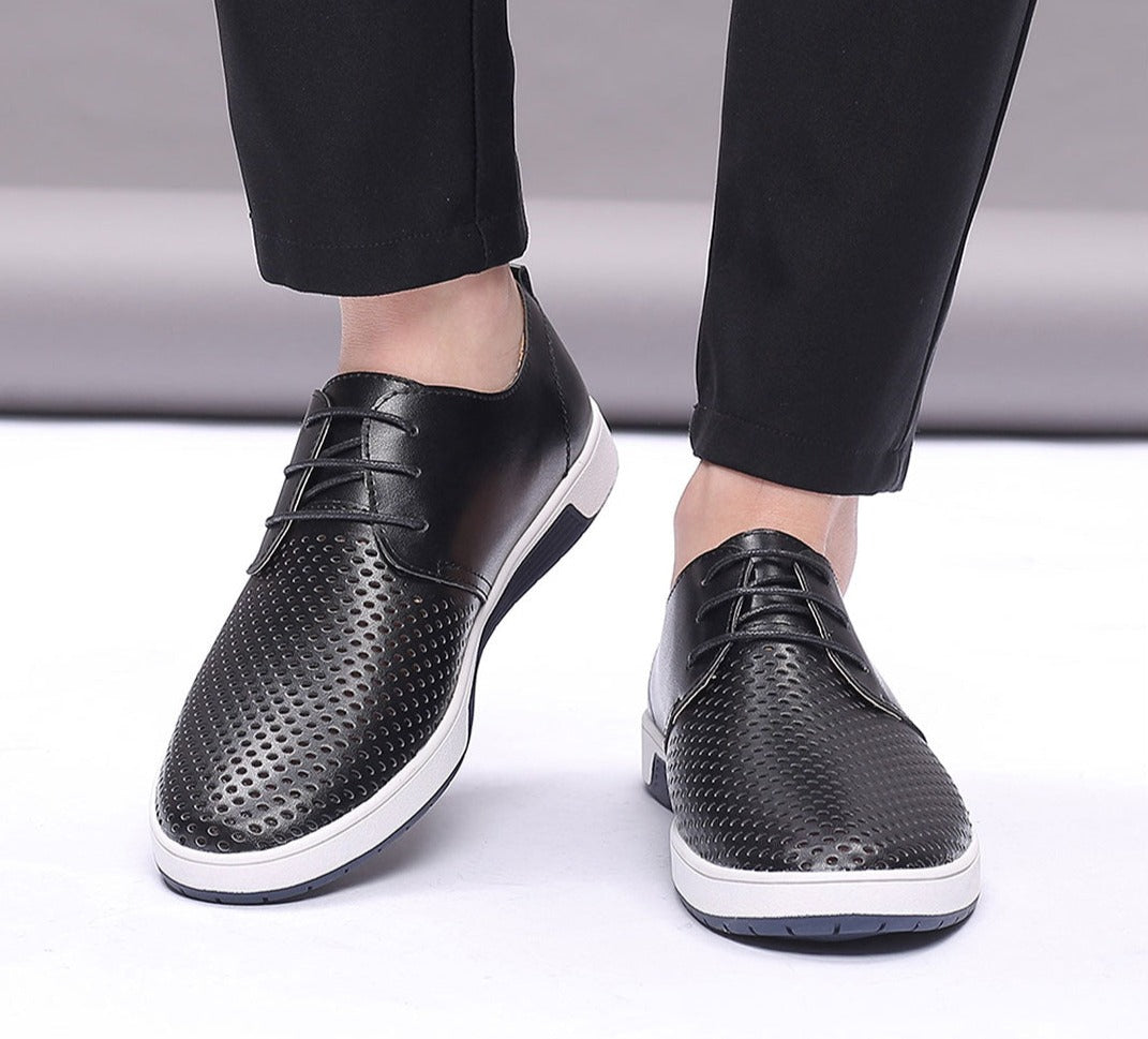 Deze Heren Casual Leren Schoenen combineren klassiek design met een sportieve touch. Het geperforeerde leren bovenwerk zorgt voor ademend comfort, terwijl de flexibele rubberen zool maximale grip biedt. Ideaal voor zowel casual als semi-formele outfits, perfect voor dagelijks gebruik en zomerse dagen.
