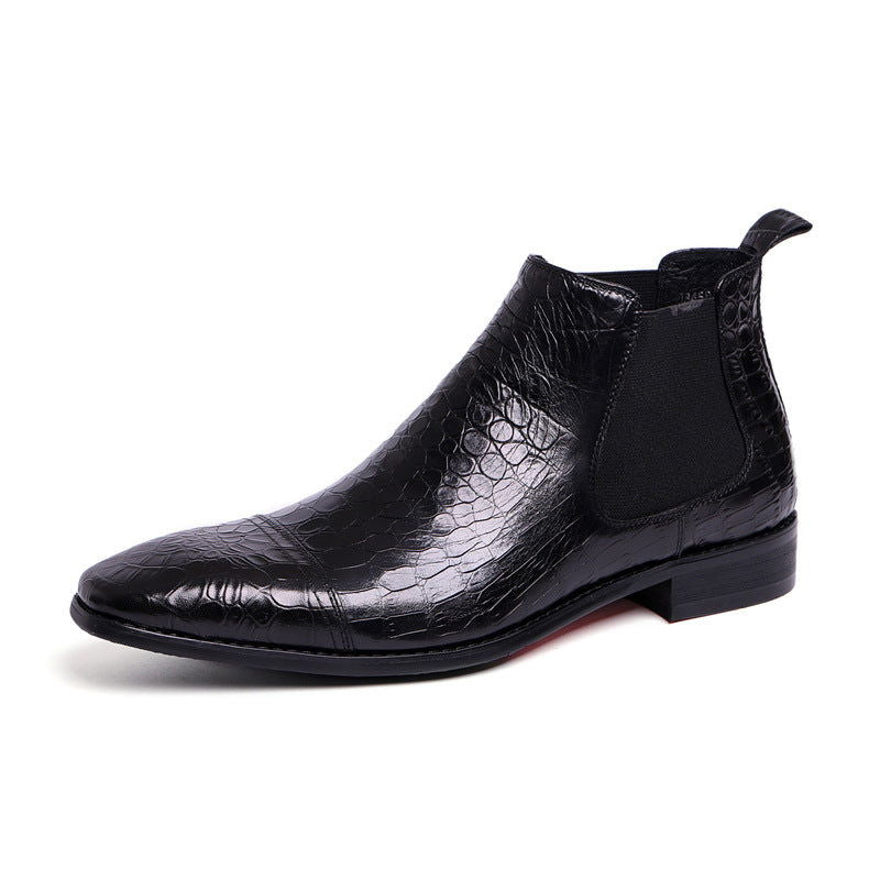 Deze chelsea boots zijn ontworpen voor stijlbewuste mannen die houden van een verfijnde, maar opvallende look. Het croco-reliëf in hoogwaardig synthetisch leer zorgt voor een exclusieve uitstraling, terwijl het elastische inzetstuk en de handige aantreklus zorgen voor makkelijk aan- en uittrekken. De slanke neus en klassieke zool met rode gripdetail geven het geheel een fashionable edge. Perfect voor zowel zakelijke als casual-chique outfits.