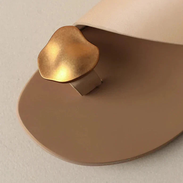 De Soleil Sandal is een subtiele eyecatcher die kunst en comfort samenbrengt. Met een unieke metallic tenenring en elegante leren bandjes, straalt deze sandaal minimalistische luxe uit. Het platte design zorgt voor moeiteloos draagcomfort, terwijl de sculpturale details een moderne twist geven. Perfect voor warme dagen waarop je stijlvol én comfortabel wilt zijn.