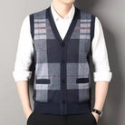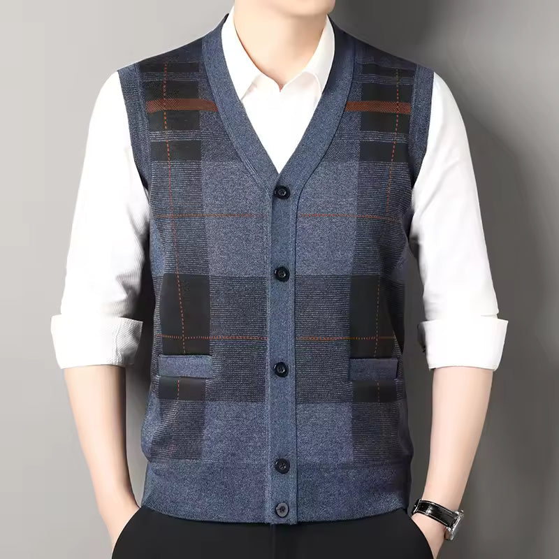 Breng vintage stijl terug met deze klassieke heren spenser met ruitpatroon. Gemaakt van een zachte en ademende gebreide stof, is dit mouwloze vest ideaal om over een overhemd te dragen – perfect voor zowel formele als casual gelegenheden. De diepe V-hals, knoopsluiting en contrasterende patronen geven het vest een tijdloze, retro uitstraling.