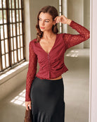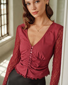 Lace Sleeve Wrap Top | Diepe V-hals & Strikdetail | Wijnrood Elegance