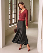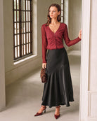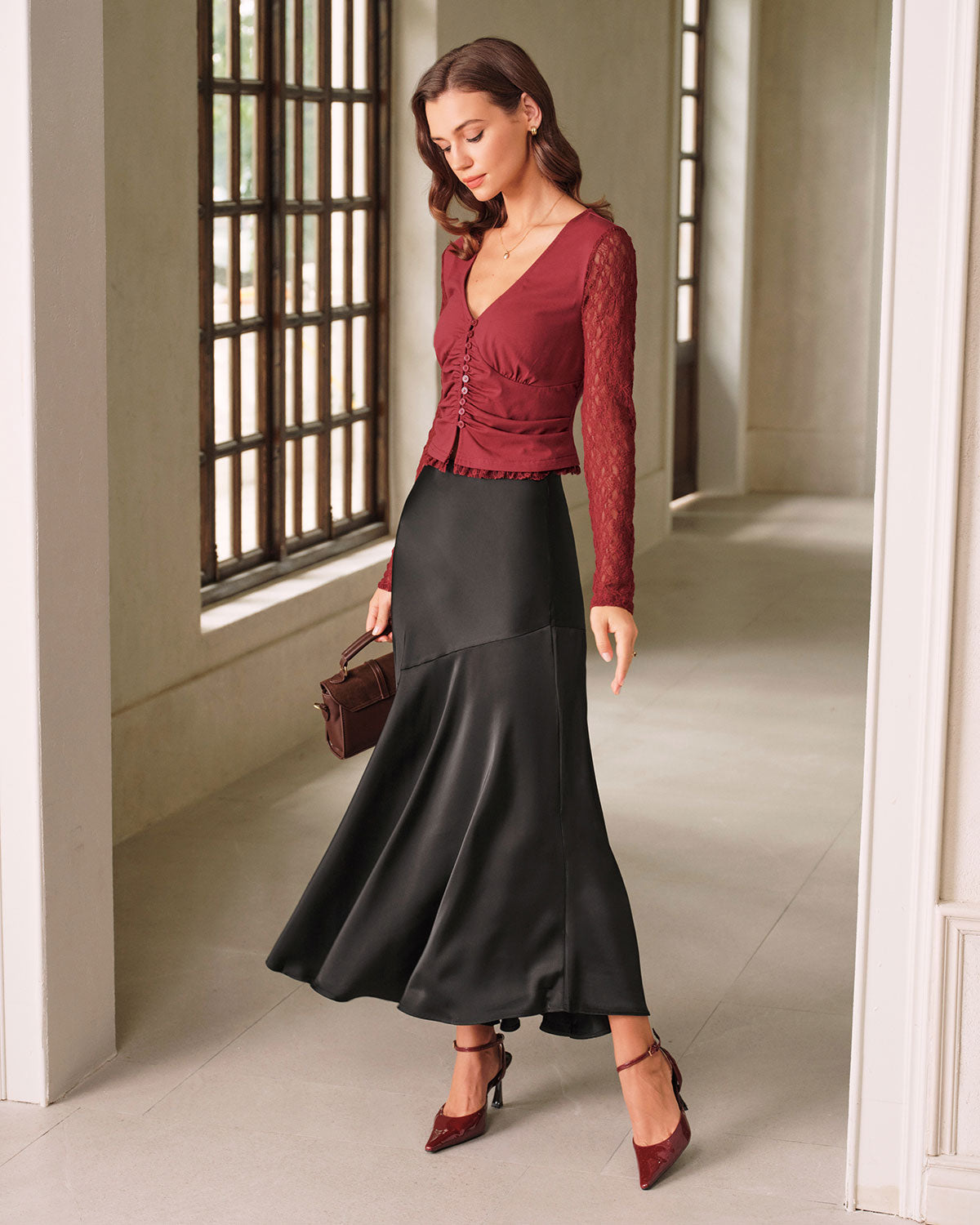 Combineer de Lace Sleeve Wrap Top met een satijnen midi-rok en hakken voor een verfijnde avondoutfit. Ook prachtig met een high-waist pantalon en clutch voor een chique dinerdate. Voeg subtiele sieraden toe om de wijnrode kleur extra te laten spreken.