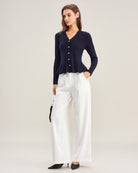 Combineer de Marine Grace Knit met een witte wide-leg broek en loafers voor een frisse, moderne look. Draag als top of open over een camisole voor extra laagjes. Perfect voor zowel kantoor als casual chic momenten.