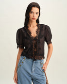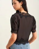De Romantic Lace Blouse is een verfijnd en vrouwelijk item met een vleugje vintage allure. Uitgevoerd in zwart met delicate kanten details langs de V-hals en zoom, straalt deze blouse elegantie en charme uit. De korte pofmouwen zorgen voor een speels en romantisch silhouet, terwijl de licht doorschijnende stof een subtiele sensualiteit toevoegt.