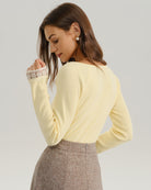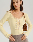 De Romantic Lace Knit is een dromerig en vrouwelijk item dat zachtheid en verfijning perfect samenbrengt. De subtiele pastelgele kleur, gecombineerd met een delicate vetersluiting en kanten afwerking bij de hals en mouwen, straalt pure romantiek uit. Gemaakt van een fijne, rekbare knit-stof die mooi aansluit op het lichaam – ideaal voor een charmante, vrouwelijke look.