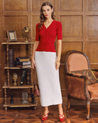 Combineer de Scarlet Knit Top met een hoge midi-rok of een nette pantalon voor een verzorgde, klassieke look. Voeg sieraden en een clutch toe voor een verfijnde touch – ideaal voor zowel kantoor als diner.