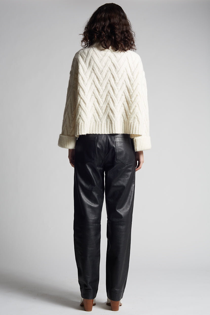 Deze trui heeft een comfortabele pasvorm en een hoge kraag voor extra comfort. Het gestructureerde kabelpatroon op de voorkant geeft de trui een interessante textuur. De wijde mouwen en losse snit zorgen voor een relaxt gevoel, ideaal voor koelere dagen.