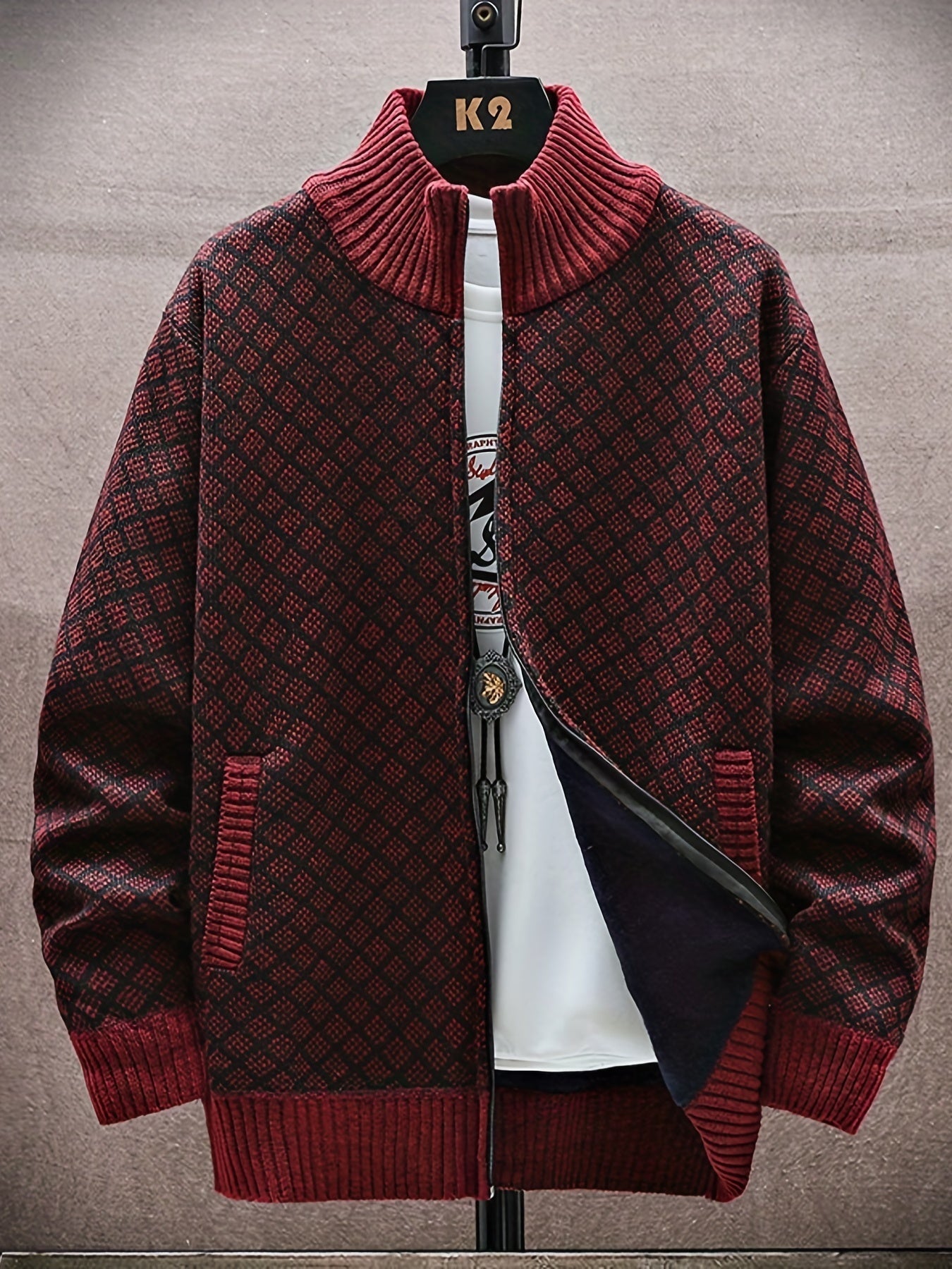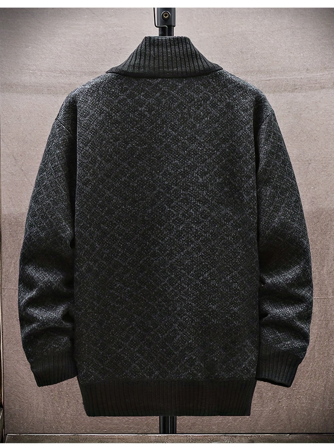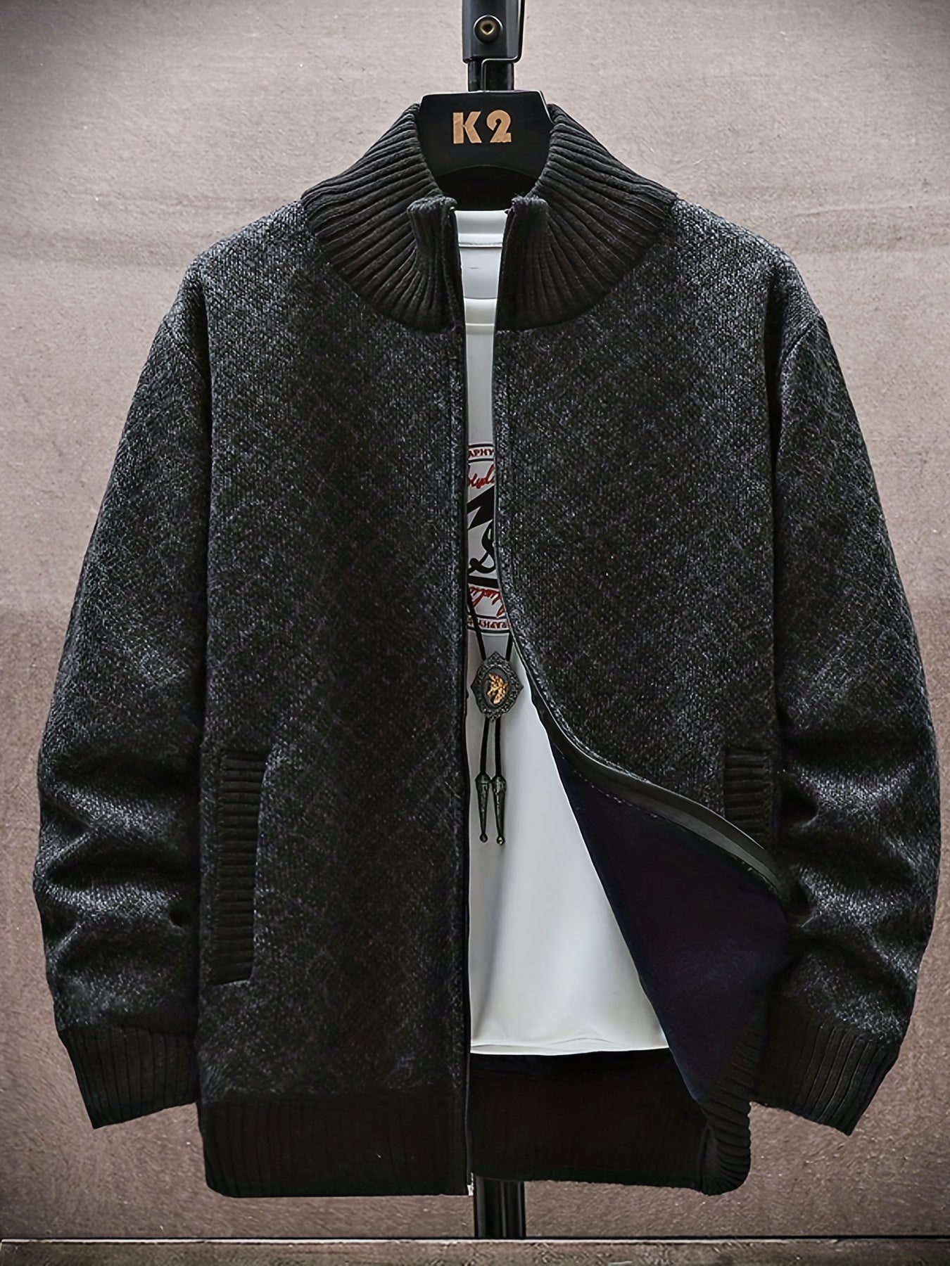- Design: Fijn gebreid patroon met opstaande kraag en ritssluiting