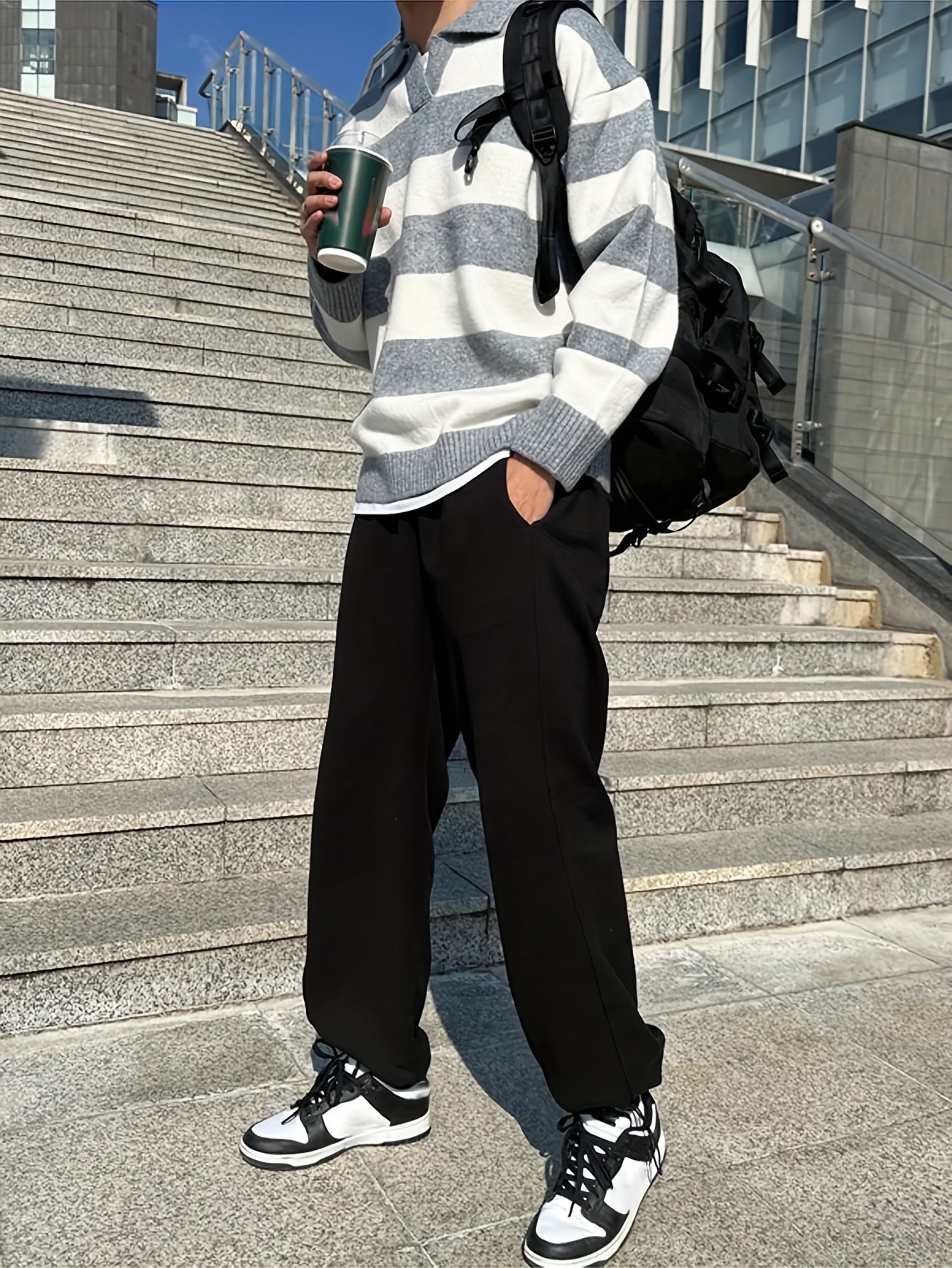 Draag deze gebreide polo trui met een zwarte of wijde broek en sneakers voor een moeiteloos stijlvolle outfit. Voeg een rugzak of minimalistische accessoires toe voor een moderne en casual look!