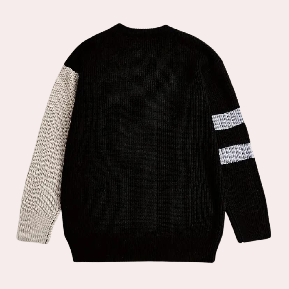 Deze moderne trui combineert zachte, verticale panelen met een uniek gestreept detail op de mouw. Het resultaat is een uitgesproken, maar toch minimalistische look. Gemaakt van een zachte en warme knit, perfect voor dagelijks gebruik in herfst en winter. De combinatie van zwart, wit, lichtgrijs en blauw zorgt voor veelzijdigheid in styling – van street tot smart casual.