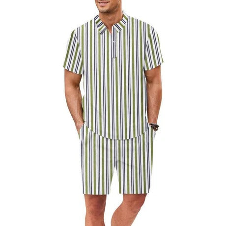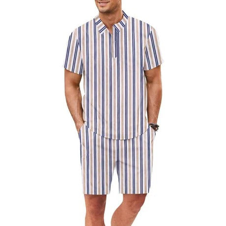 De Capri Stripe Set straalt tijdloze zomerse charme uit. Deze tweedelige set bestaat uit een kortemouwen overhemd en een bijpassende short, beide uitgevoerd in een klassiek verticaal strependesign. De frisse kleuren en luchtige pasvorm maken dit een ideale keuze voor warme dagen, of je nu aan de kust bent of door de stad wandelt.