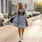 De Alpenlicht Dirndl is een ode aan traditionele charme met een moderne twist. Deze elegante dirndl combineert een klassiek zwart lijfje met sierlijke veterdetails en een contrasterende zilverkleurige schort. De subtiele borduursels en het vrouwelijke silhouet zorgen voor een verfijnde en feestelijke uitstraling – perfect voor Oktoberfest of andere culturele evenementen.