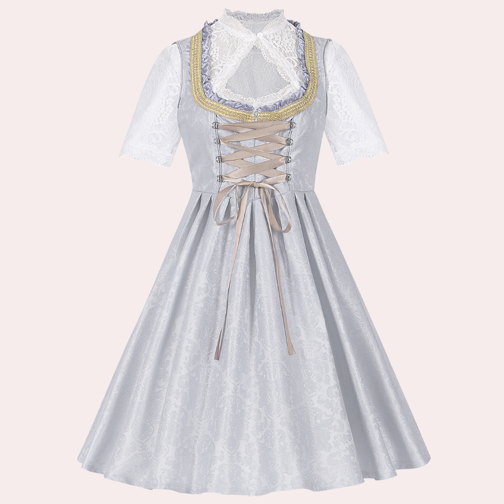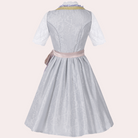 De Alpenrose Dirndl is een verfijnde ode aan traditie met een moderne twist. Deze prachtige dirndl combineert een elegante zilvergrijze basis met romantisch kant en subtiele borduursels. De satijnen strik in zachtroze geeft een vrouwelijke touch, terwijl het lijfje met goudkleurige details zorgt voor een luxe uitstraling. Ideaal voor Oktoberfest, culturele evenementen of feestelijke gelegenheden met een folkloristische flair.