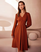 De Amber Elegance Jurk straalt warmte en verfijning uit in een rijke amberkleurige tint. Met een diepe V-hals, lange mouwen en een flatterend strikdetail in de taille, is deze midi-jurk ontworpen om het figuur op elegante wijze te accentueren. De soepelvallende stof en zwierige rok zorgen voor een natuurlijke, vrouwelijke beweging — ideaal voor zowel overdag als ’s avonds.
