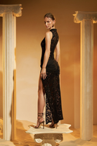 De Aphrodite Lace Gown is een betoverende avondjurk die luxe en verleiding perfect in balans brengt. Met een hoge halslijn, transparante kanten stof en een diepe split aan de voorkant straalt deze jurk een krachtige, vrouwelijke allure uit. De geraffineerde afwerking en sculpturale pasvorm maken dit dé keuze voor onvergetelijke nachten.
