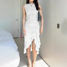De Aria Ruffle Dress combineert verfijning met een vleugje speelsheid. Deze bodycon jurk is ontworpen met een elegante hoge halslijn, een nauwsluitende pasvorm en een opvallende asymmetrische zoom afgewerkt met ruches. De split aan de voorkant zorgt voor extra beweging en allure. Perfect voor diners, cocktailfeestjes of een avond uit waarin je wilt stralen met subtiele flair.