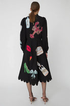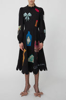 De Artistic Flair Dress is een gedurfde midi-jurk die kunst en mode combineert. Het zwarte ontwerp wordt verlevendigd door levendige bloemen- en dierenmotieven die als kunstwerken op de stof zijn geweven. De delicate kantdetails langs de onderkant geven de jurk een elegante afwerking, terwijl de speelse patronen zorgen voor een unieke en expressieve uitstraling. Deze jurk is ideaal voor een kunstgalerij, een modeshow of een speciale avond uit.