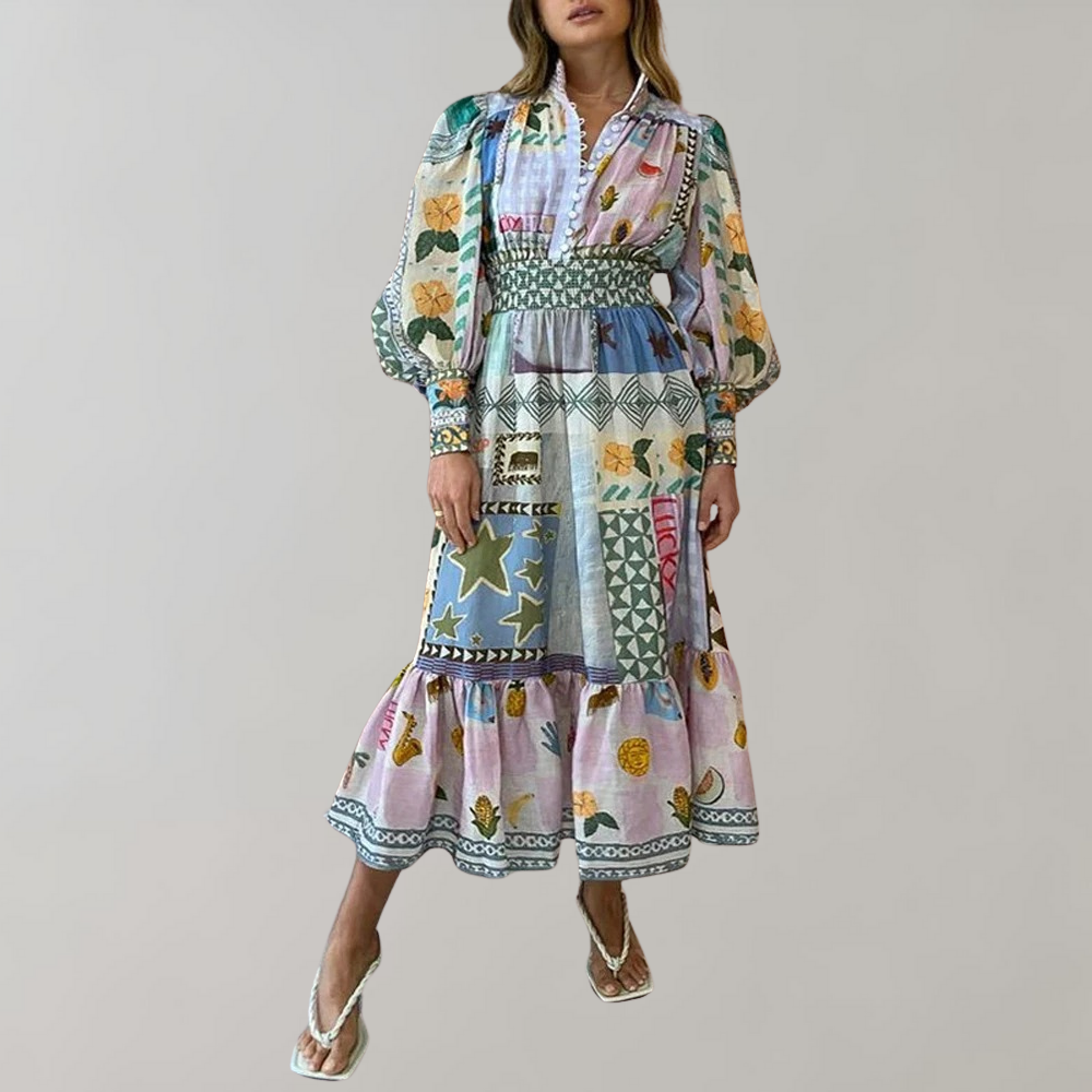 Aurora Jurk | Midi Boho Chic | Patchwork Print & Pofmouwen