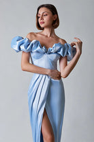De Azure Bloom Gown is een kunstwerk op zich, waarin couturevolume en vrouwelijke elegantie samenkomen. Deze off-shoulder maxi-jurk in een zachte blauwe tint is voorzien van dramatische, geplooide bloemmouwen en een nauwsluitende plissé-rok met hoge split. De structuur en verfijning maken dit een showstopper voor gala’s en exclusieve avonden.