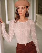 De Belle Lace Top ademt romantiek en verfijning. Met zijn delicate kanten textuur en licht doorschijnend ontwerp is dit topje een subtiel statement van vrouwelijke elegantie. De aansluitende pasvorm en lange mouwen zorgen voor een charmante retro uitstraling, perfect voor stijlvolle herfst- en winterlooks. Ideaal te combineren met een high-waisted rok of pantalon voor een sierlijke, Franse flair.