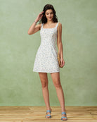 De Blossom Belle Dress is een frisse, vrouwelijke mini-jurk die perfect is voor zonnige dagen en luchtige momenten. De delicate bloemenprint op een zachte witte achtergrond straalt romantiek uit, terwijl de vierkante halslijn en aangesloten taille een flatterend silhouet creëren. Ideaal voor zowel casual uitstapjes als zomerse feestjes.