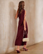Draag de Bordeaux Luxe Dress met strappy heels en een clutch met metallic accenten voor een verfijnde avondlook. Voeg statement oorbellen toe om de elegante halterlijn te accentueren. Een tijdloze keuze voor elke speciale gelegenheid.