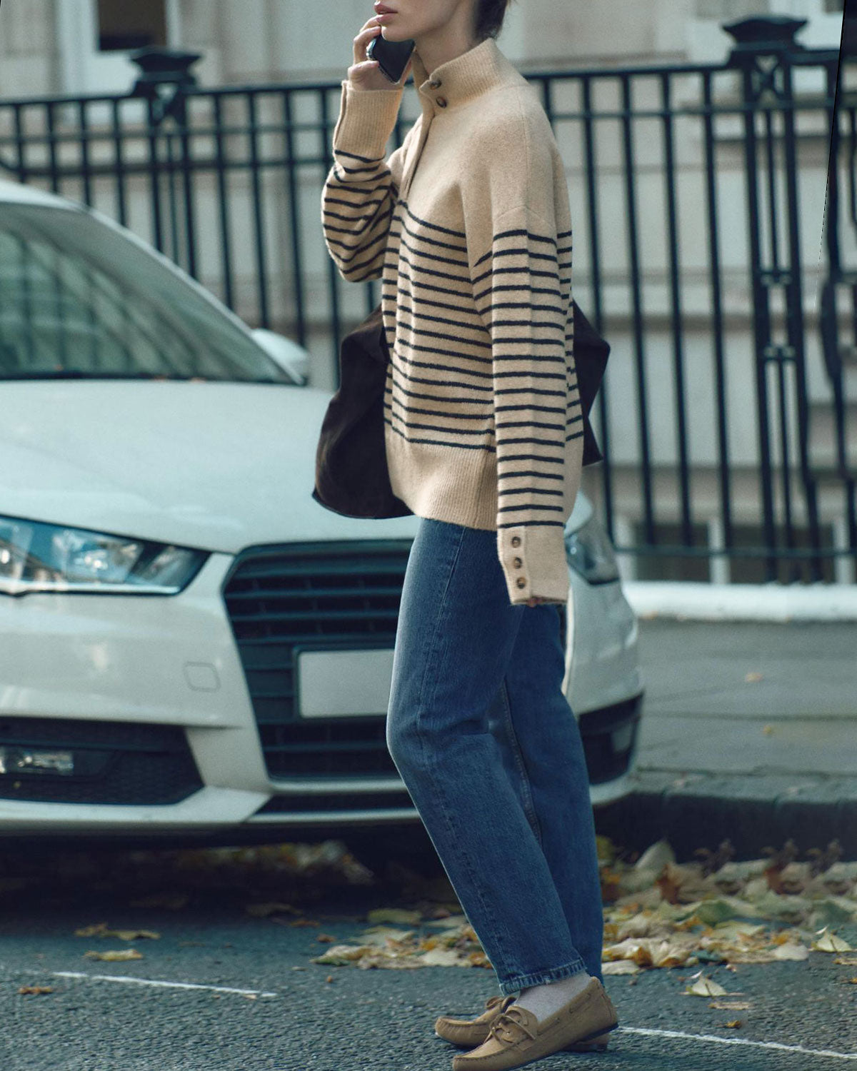 Combineer de Breton Knit Sweater met een rechte jeans en enkellaarsjes voor een moeiteloze city look. Voeg een leren shopper toe voor een stijlvolle outfit die perfect is voor onderweg of een ontspannen weekend.