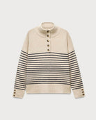 De Breton Knit Sweater is een stijlvolle knipoog naar klassieke maritieme mode. Het crèmekleurige breisel met navy strepen geeft deze trui een frisse en tijdloze uitstraling. De hoge kraag met knoopdetails voegt een eigentijdse twist toe en biedt extra warmte op koude dagen. Perfect voor een nonchalante, maar verzorgde look.