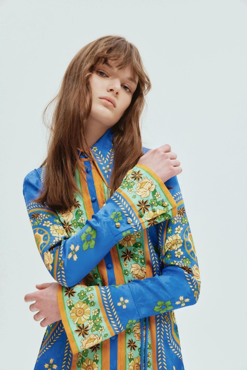 De Capri Dress is een echte eyecatcher die mediterrane charme en artistieke flair samenbrengt. Met een opvallende barokprint in levendig blauw, geel en groen straalt deze satijnen mini jurk luxe en creativiteit uit. De rechte snit wordt geaccentueerd door de knielengte, lange mouwen en een verfijnde kraag, wat zorgt voor een elegante balans tussen speels en chic. Perfect voor wie durft op te vallen.