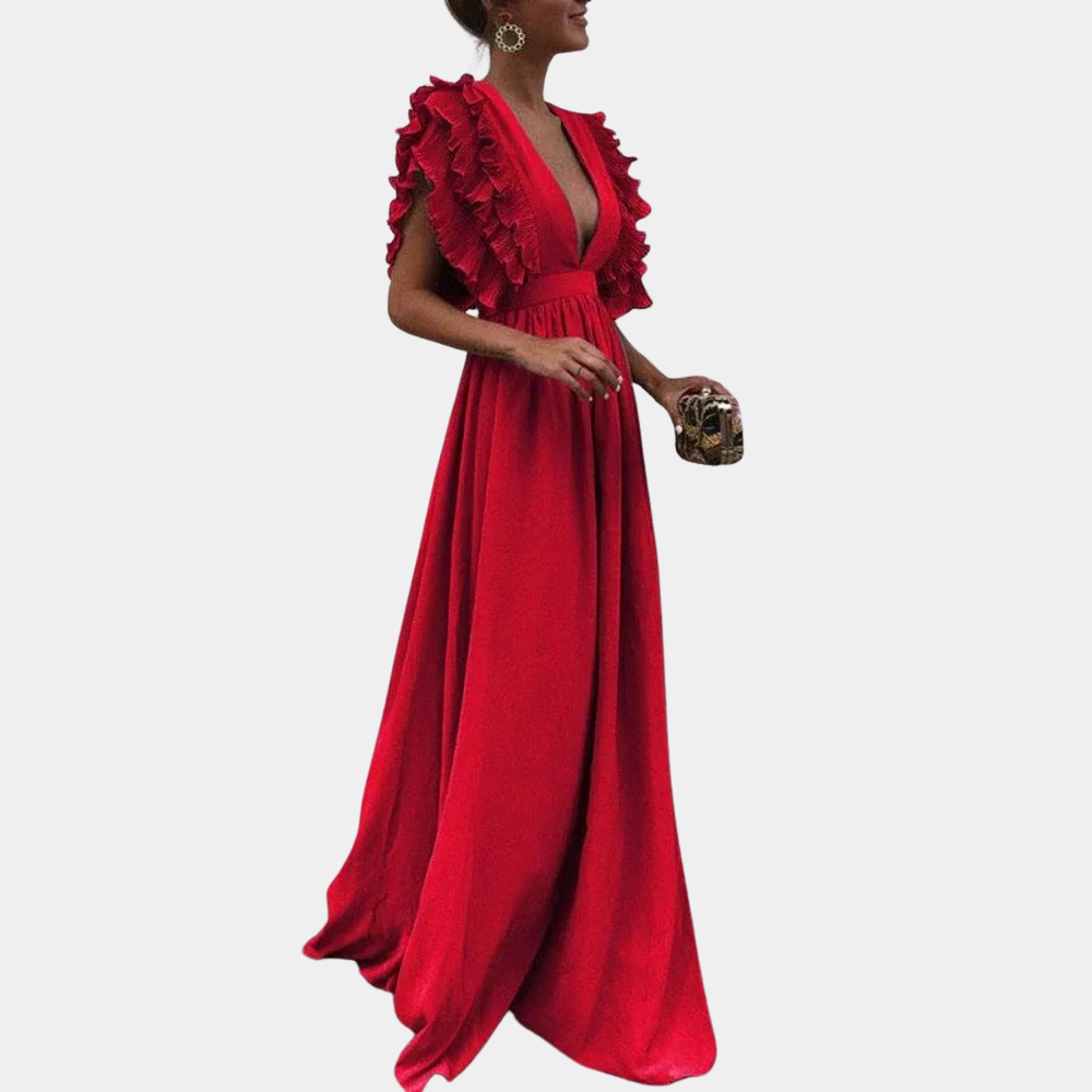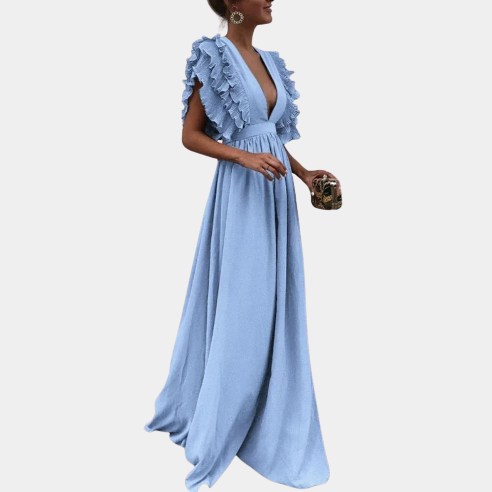 De Celeste Gala Jurk is een luxueus statementstuk met een betoverende uitstraling. De diepe V-hals en vloeiende maxi-lengte zorgen voor een elegante look, terwijl de gelaagde ruches op de schouders een dramatische en vrouwelijke touch toevoegen. Deze jurk is perfect voor formele gelegenheden waar je wilt schitteren met stijl en klasse.