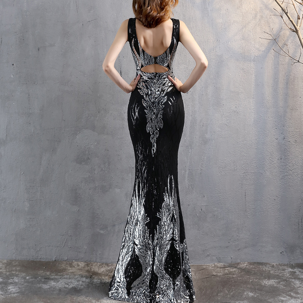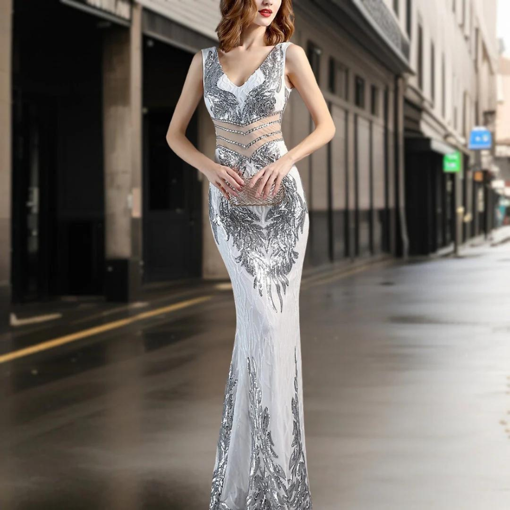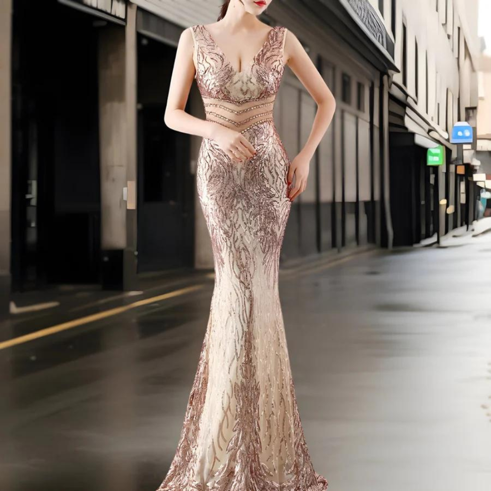De Celestia Gown is een betoverende avondjurk die pure elegantie en allure uitstraalt. Met een aansluitende pasvorm, diepe V-hals en glamoureuze paillettenaccenten is deze jurk ontworpen voor bijzondere momenten. De combinatie van fluwelen textuur en schitterende patronen creëert een dramatisch, maar verfijnd effect – ideaal voor gala’s, rode loper evenementen of een exclusieve avond uit.