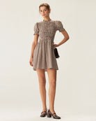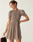 De Checkered Charm Dress brengt een vleugje retro-elegantie in je garderobe. Met haar subtiele bruin-beige ruitpatroon, korte pofmouwen en getailleerde snit straalt deze jurk een klassieke charme uit. De uitlopende rok zorgt voor een vrouwelijk silhouet, terwijl de zachte geweven stof comfort biedt zonder in te boeten op stijl.