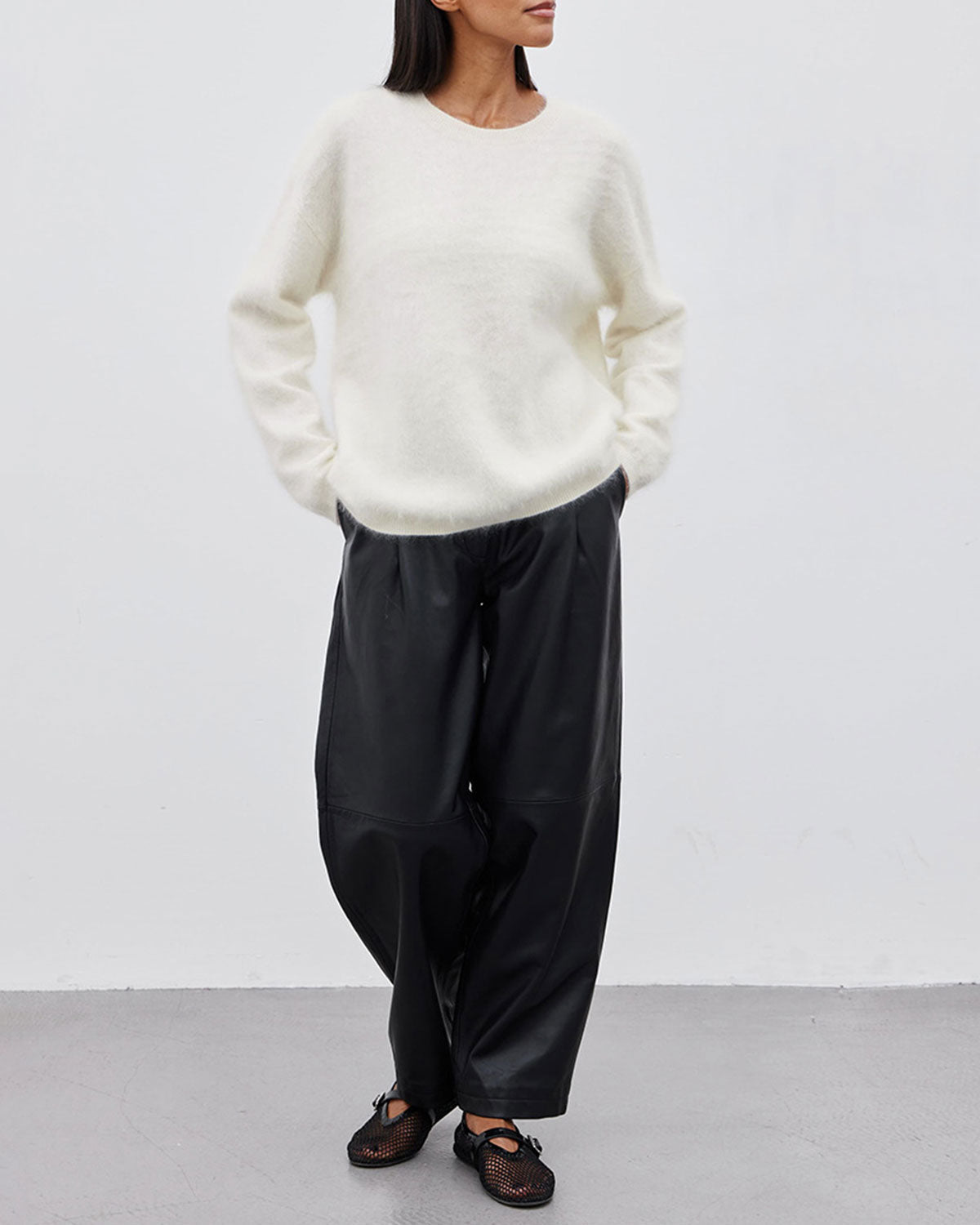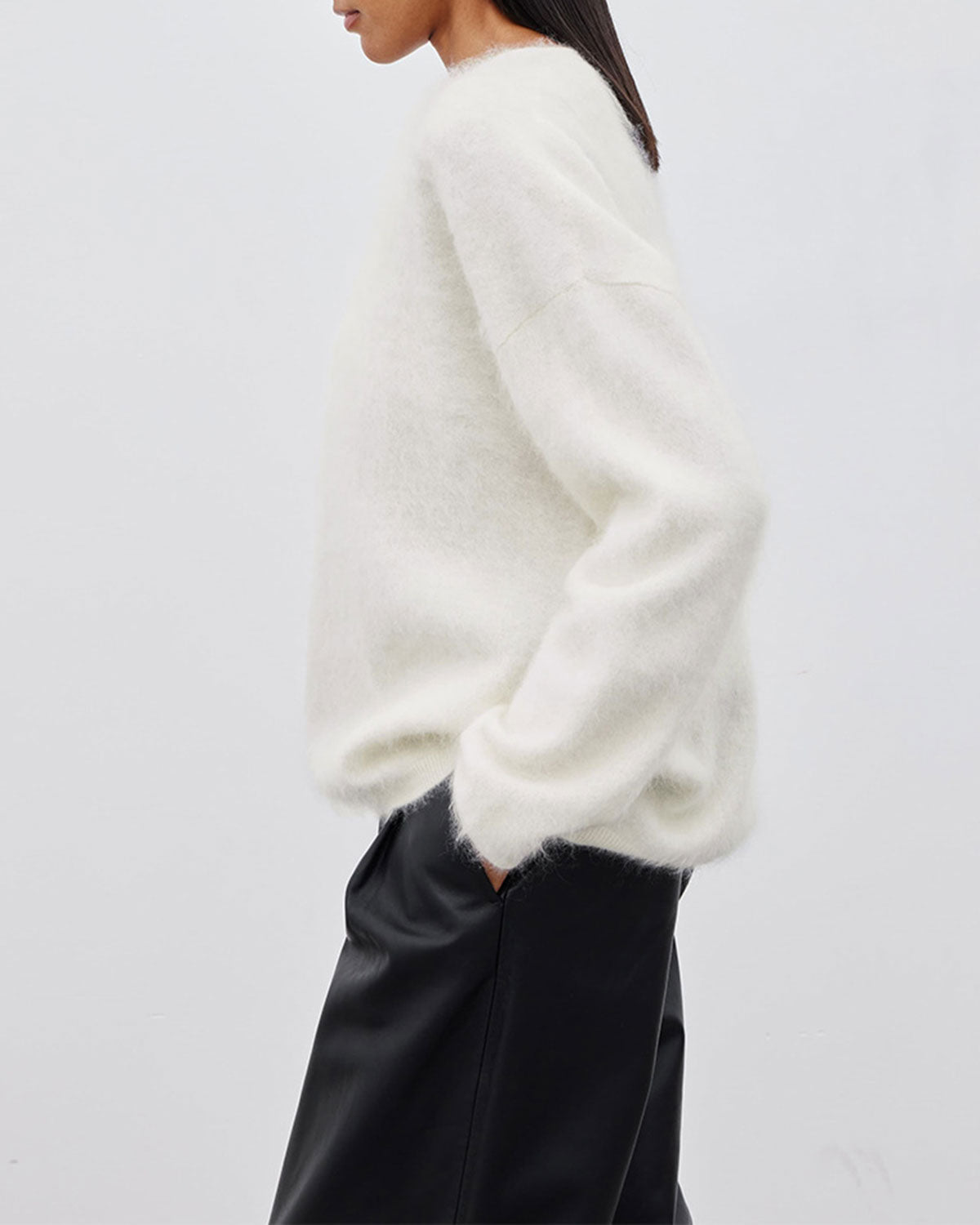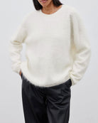 Combineer de Cloud Soft Sweater met een leren broek of denim voor een speels contrast tussen texturen. Perfect voor een cozy dag thuis of een nonchalante city look met sneakers en een crossbody tas.