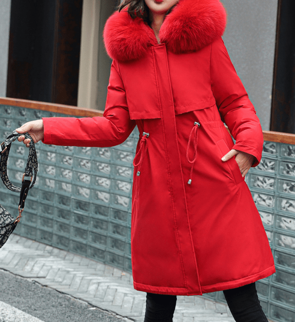 Deze jas heeft een lange pasvorm en is voorzien van een capuchon en een pluizige kraag. Voorzien van een praktische rits en een tailleband voor individuele aanpassing. De jas heeft een zachte voering die warmte biedt en ideaal is voor koudere dagen.