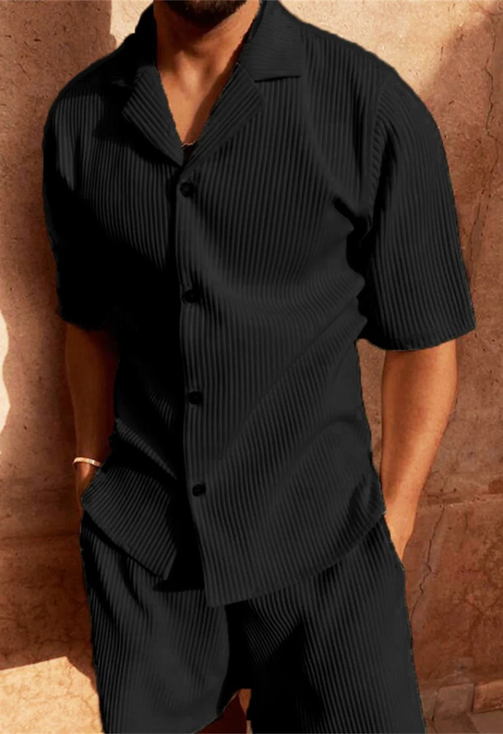Deze stijlvolle set bestaat uit een losvallend overhemd met korte mouwen en een bijpassende short met elastische tailleband. De subtiele verticale streepstructuur geeft het geheel een verfijnde look, terwijl de luchtige stof perfect is voor warm weer. Ideaal voor vakanties, stranddagen of als stijlvolle loungewear. Makkelijk te dragen als complete set of los te combineren.