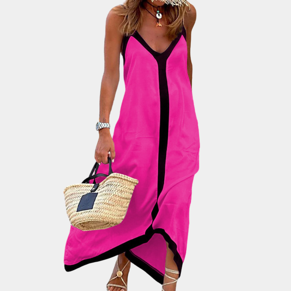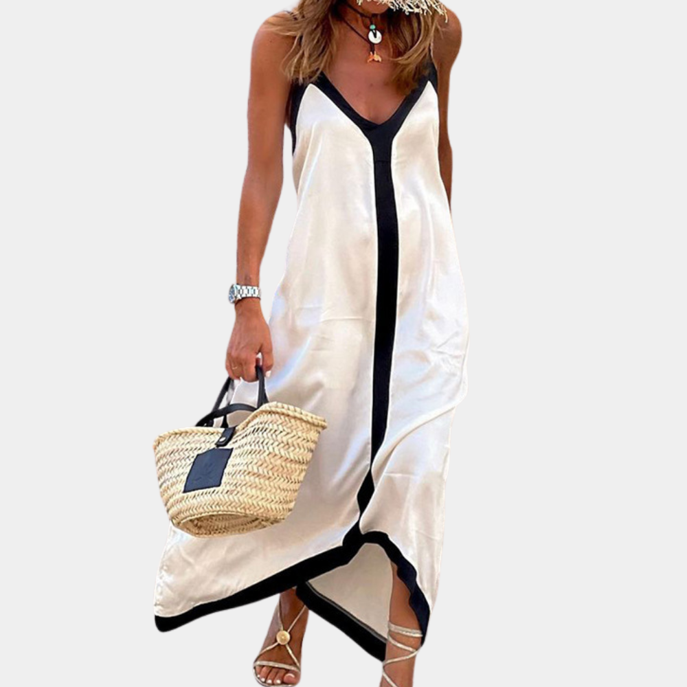 Niva Dress | Satijnen Maxi-jurk | Contrastbiezen & V-Hals