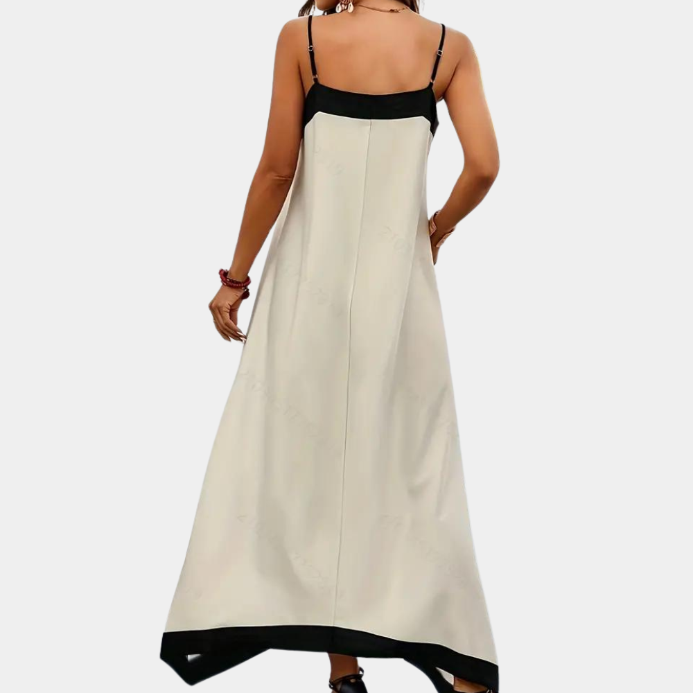 De Niva Dress is een elegante en moderne maxi-jurk met een opvallend contrastdetail. Gemaakt van glanzende satijnachtige stof die zacht over het lichaam valt, straalt deze jurk luxe en comfort uit. De zwarte biesaccenten en diepe V-hals zorgen voor een krachtige, stijlvolle uitstraling – ideaal voor zomerse avonden of chique vakantiedagen.