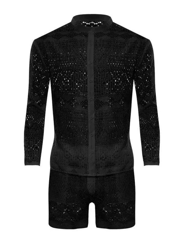 De Sheer Lace Set voor heren is een gewaagde en stijlvolle keuze voor wie wil opvallen. Deze tweedelige set bestaat uit een luchtig transparant shirt en een bijpassende korte broek, beide vervaardigd uit fijn kant met een uniek patroon. Ideaal voor festivals, strandfeesten of zomerse avondjes uit. Verkrijgbaar in zwart en wit voor een uitgesproken look met klasse.