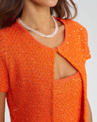 Draag de Tangerine Knit Twinset met een witte midi-rok of linnen broek voor een frisse zomerlook. Voeg sandalen en een lichte tas toe voor een stijlvolle outfit die perfect is voor brunches, vakanties of zomerse avonden.