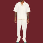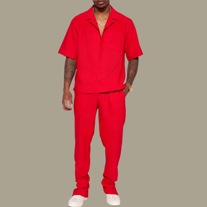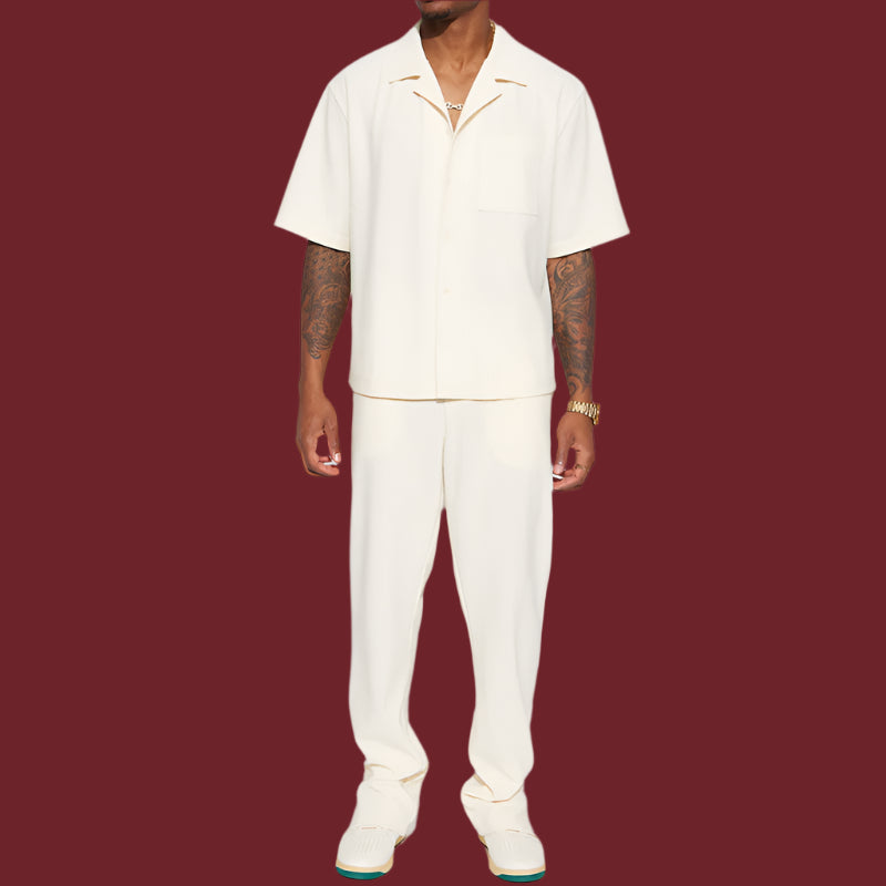 De Urban Lounge Set combineert comfort met een moderne, minimalistische stijl. Deze tweedelige set bestaat uit een kortmouw overhemd met kraag en een bijpassende rechte broek. Gemaakt van een soepele en luchtige stof, ideaal voor zowel casual als stijlvolle gelegenheden.